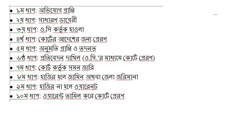 | ৫ | ৪র্থ ধাপ: কোর্টের আদেশের জন্য প্রেরণ ৫ম ধাপ: অনুমতি প্রাপ্তি ও তদন্ত ৬ষ্ঠ ধাপ: প্রতিবেদন দাখিল (ও.সি.'র মাধ্যমে কোর্টে প্রেরণ) ৭ম ধাপ: কোর্ট কর্তৃক সমন জারি ৮ম ধাপ: হাজির হলে জামিন অথবা জেলা জরিমানা ৯ম ধাপ: হাজির না হলে ওয়ারেন্ট | দেখুন | |